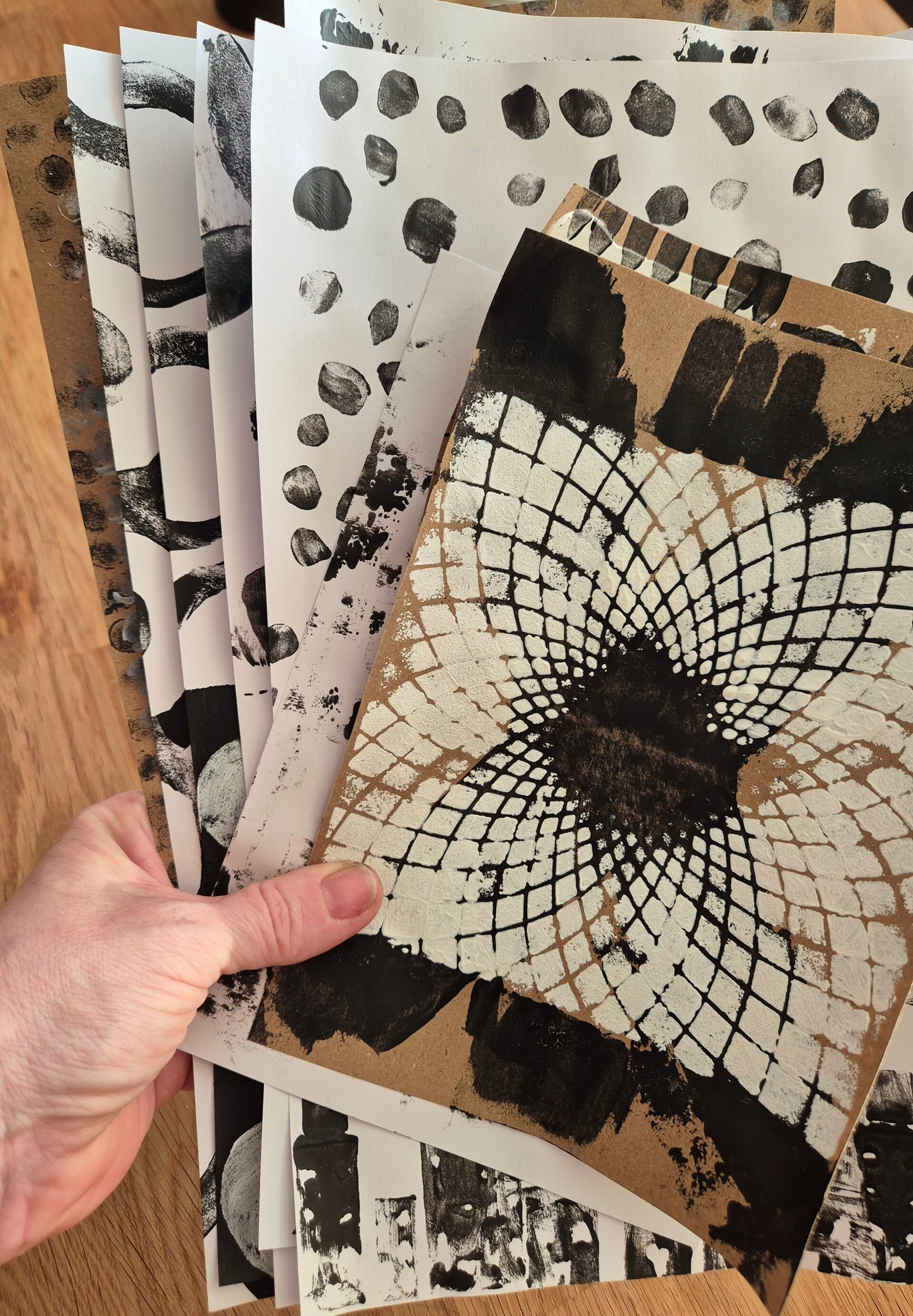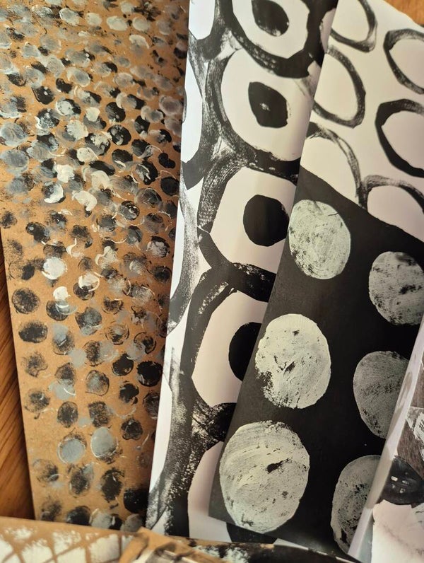 Eine kuratierte Kollektion handbemalter Hintergrundpapier in einer ausdrucksstarken und zugleich harmonischen Farbwelt aus Schwarz, Weißund Naturtönen.