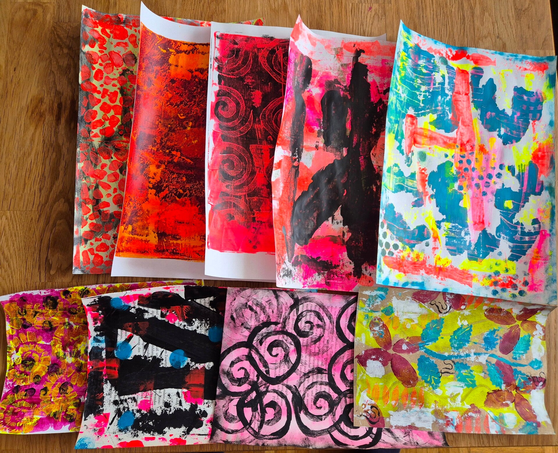 Jedes Papier wurde mit Acrylfarbe, Gelli Plate, Stempeln und verschiedenen Techniken gestaltet.